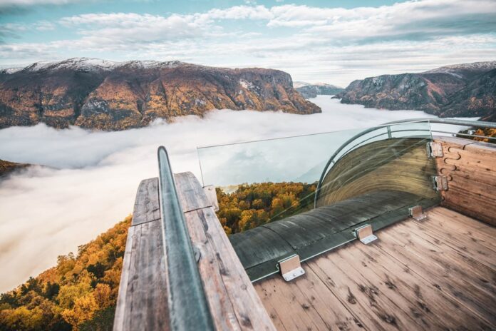 El mirador Stegastein de Aurland, Noruega, ofrece una vista panorámica a lo largo de la ruta turística nacional de Aurlandsfjellet. A una increíble altitud de 650 metros sobre el nivel del mar y a 30 metros de la ladera de la montaña, ofrece una fantástica vista del fiordo y las montañas, incluido el fiordo de Naeroyfjord, declarado Patrimonio de la Humanidad por la UNESCO.