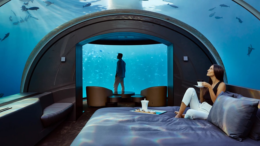 En la espectacular isla de Conrad Maldivas Rangali, el hotel The Muraka ofrece una experiencia submarina única. Esta villa de lujo es la primera de su tipo y está completamente sumergida en el océano. Los huéspedes pueden disfrutar de una vista panorámica del arrecife de coral desde su habitación, gracias a las enormes ventanas de vidrio.
