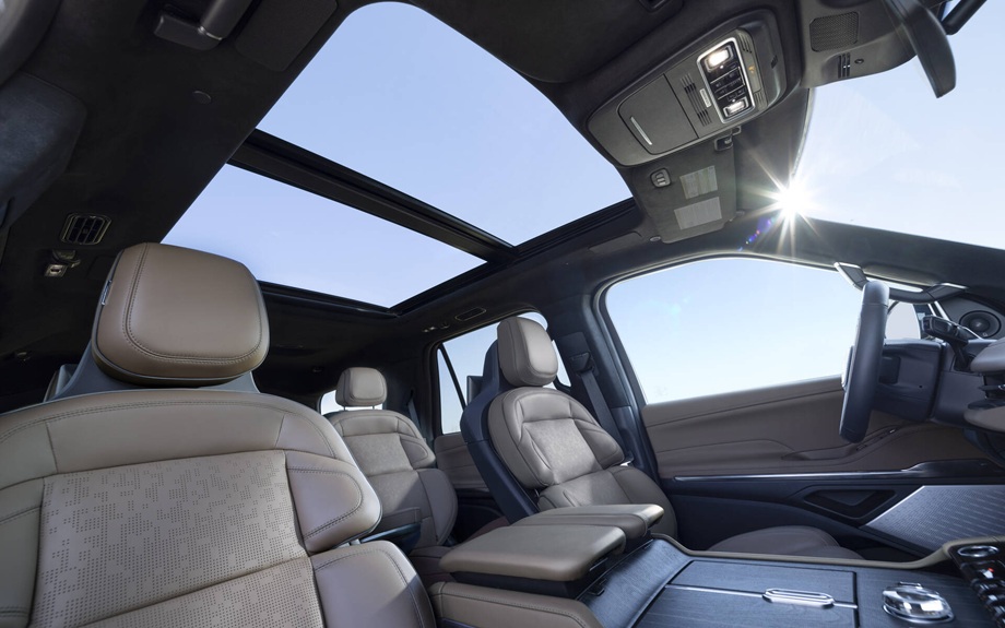 El Lincoln Navigator del 2025, con un precio inicial de $82,765, ofrece el Vista Roof más amplio, con paneles duales que cubren tres filas y apertura eléctrica frontal, creando una cabina inundada de luz natural.
