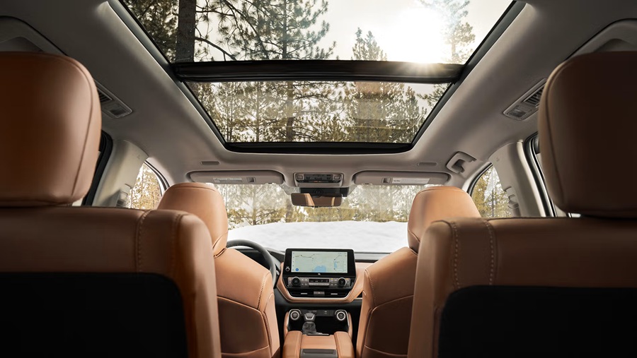 El Toyota Grand Highlander del 2025, con un precio inicial de $44,615, integra un techo panorámico fijo que cubre ampliamente tres filas, con tinte y apertura delantera opcional.
